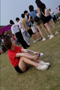 草坪上的红衣黑色热裤