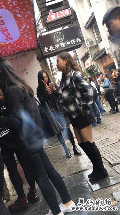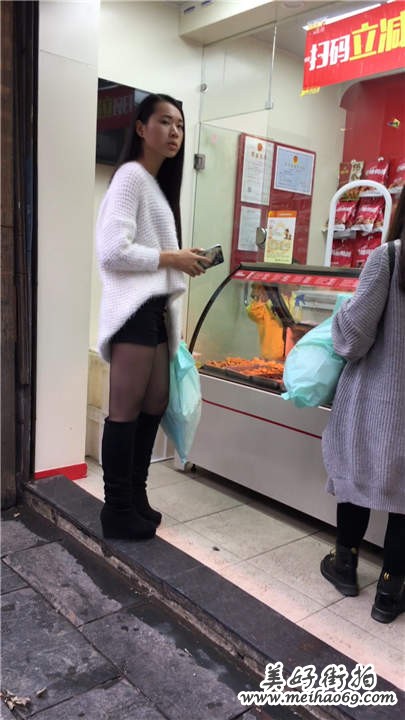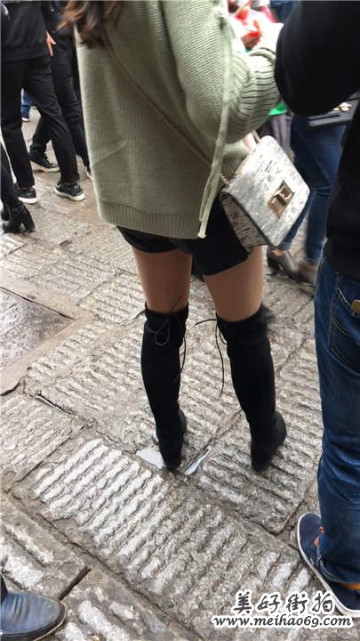 街拍白色毛衣黑色紧身短裤黑色丝袜高靴长发妹子[MOV/248M]