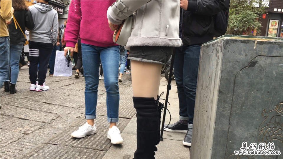 街拍黑色高靴肉色丝袜直腿灰色牛仔短裤学生妹子[MOV/191M]