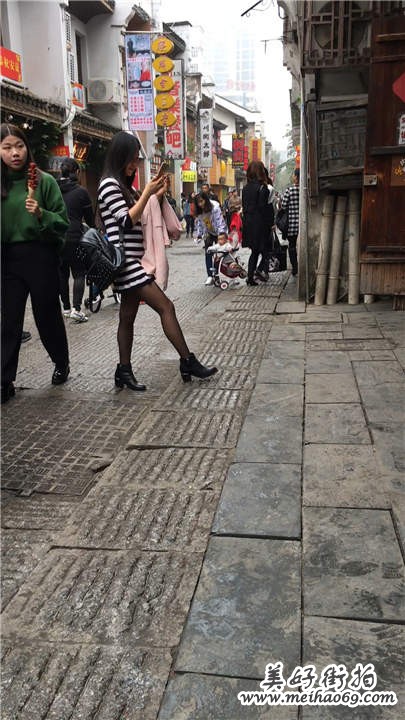 街拍条纹连衣裙黑色丝袜美腿长发妹子[MOV/203M]