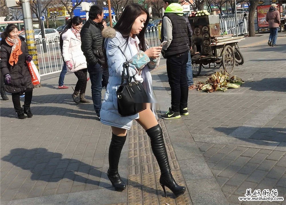 街拍黑色高筒皮鞋肉色丝袜牛仔包臀裙长发美女[MOV/147M]