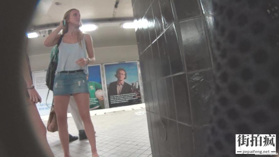 车站蓝色牛仔包臀裙性感金发洋妞[MP4/310M]