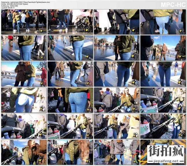 街拍蓝色紧绷牛仔裤漂亮金发美女极品圆润翘臀[MP4/909M]...