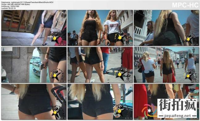 街拍黑色紧绷牛仔热裤金发美女极品圆润翘臀[MP4/367M]...