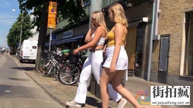 白色牛仔短裙和紧绷牛仔裤两个金发洋妞性感翘臀[MP4/246M]