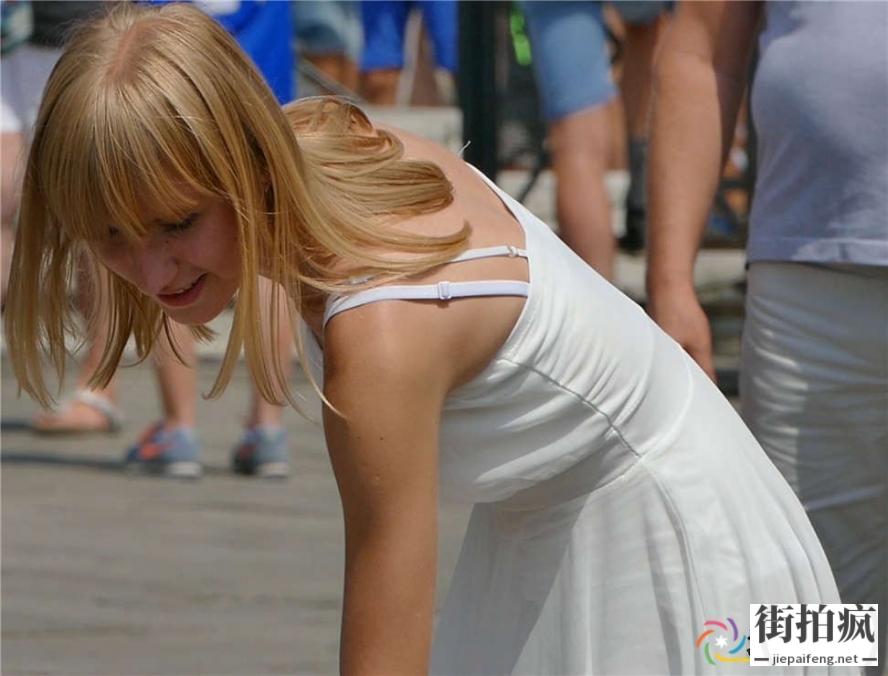 街拍白色微透连衣短裙金发美女内裤凸显[MP4/431M]