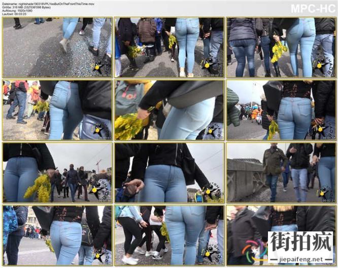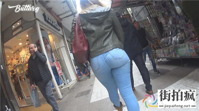 街拍蓝色紧绷牛仔裤OL洋妞极品性感翘臀[MP4/526M]