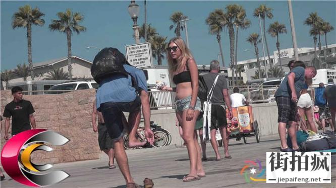 街拍蓝色牛仔短裤金发美女性感长腿紧致翘臀[MP4/865M]