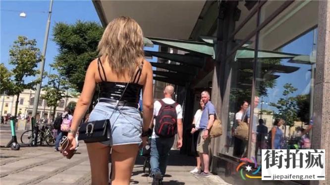 街拍蓝色牛仔热裤金发洋妞极品饱满圆润翘臀[MP4/201M]
