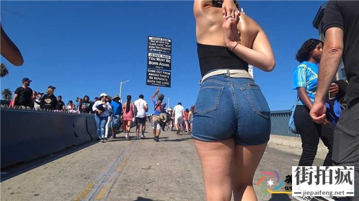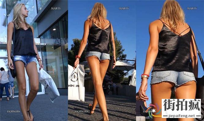 街拍蓝色牛仔热裤金发洋妞性感身材大长腿圆润翘臀[MP4/408M]