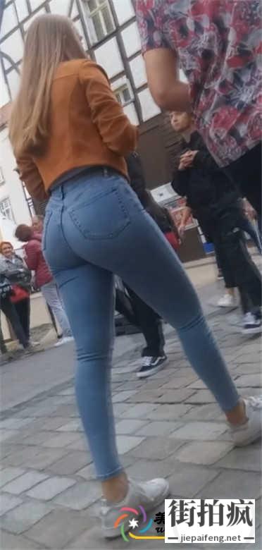 街拍蓝色紧绷牛仔裤性感美腿圆润翘臀金发美眉[MP4/366M]