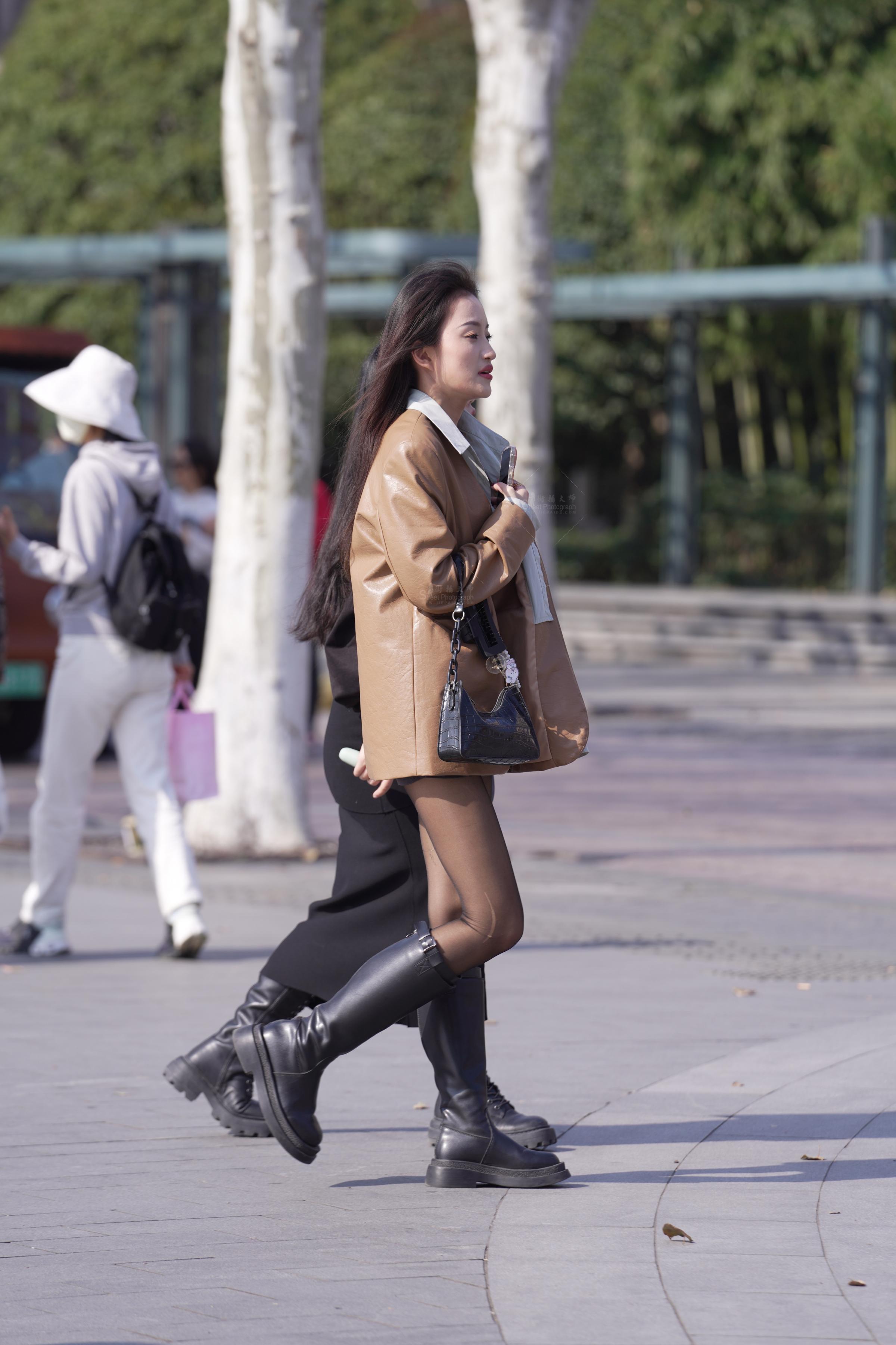 【街拍心灵】大长腿黑si皮短裤