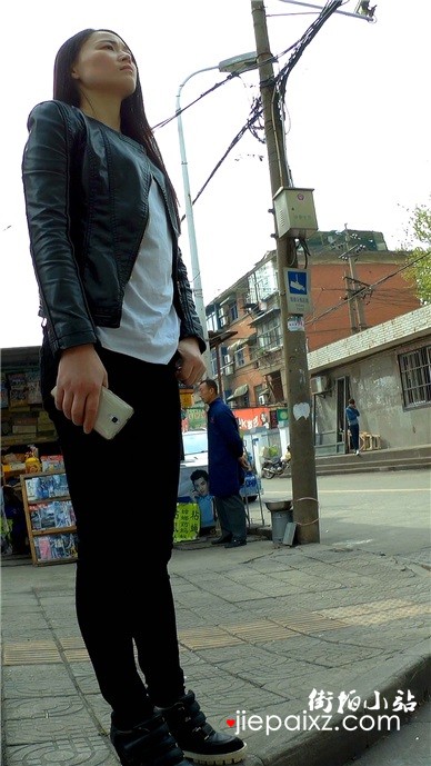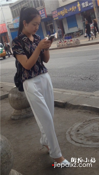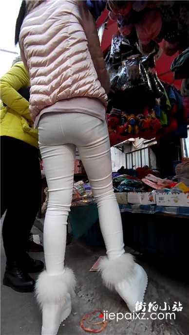 街拍长腿紧身白裤粉色毛毛鞋美眉