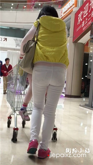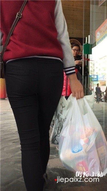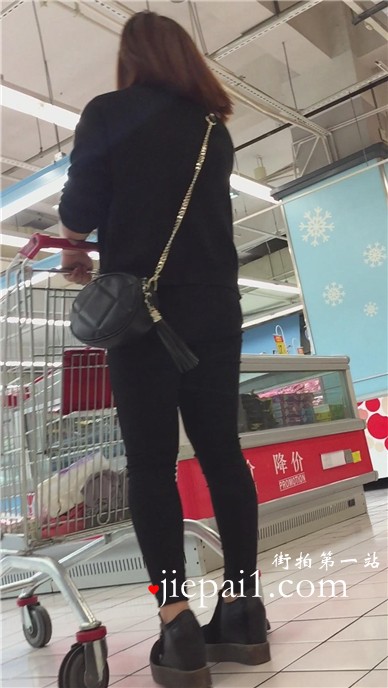 黑色紧身裤美眉逛超市。