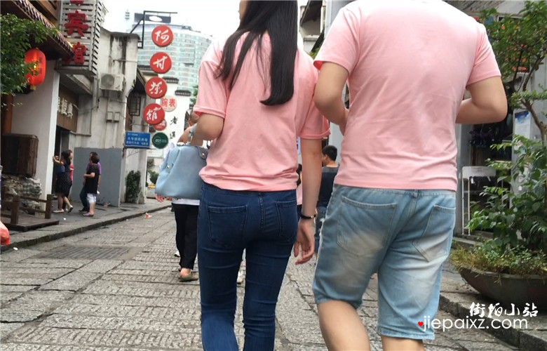 粉色T恤衫紧身蓝牛宽臀美眉
