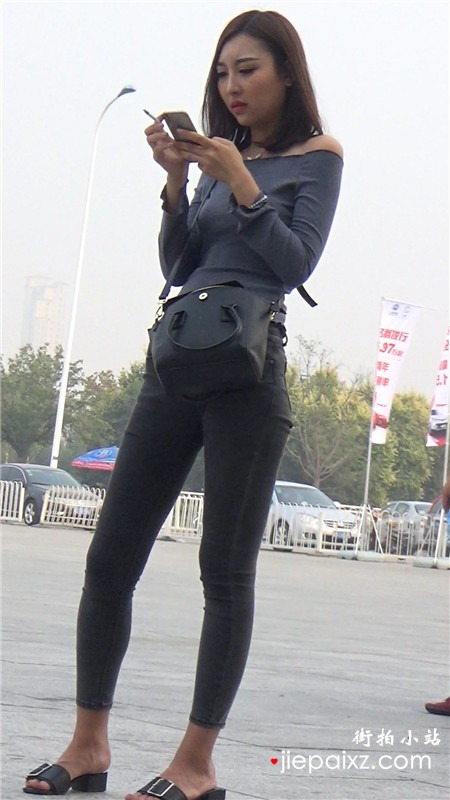紧身牛仔裤美腿高跟凉鞋美眉