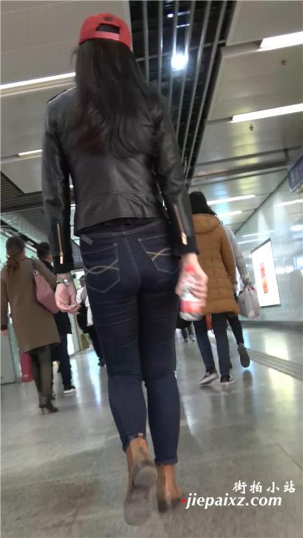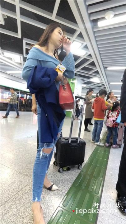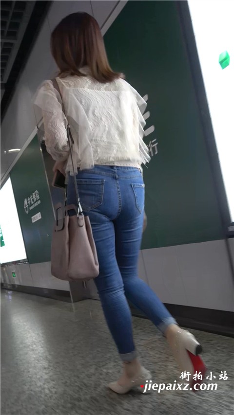 街拍等地铁的宽臀紧身蓝色牛仔裤小美女