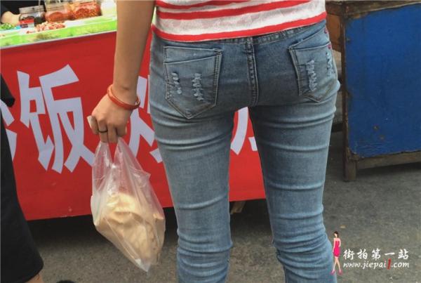 街拍紧身蓝牛MM买蛋炒饭,美女腿真细直。