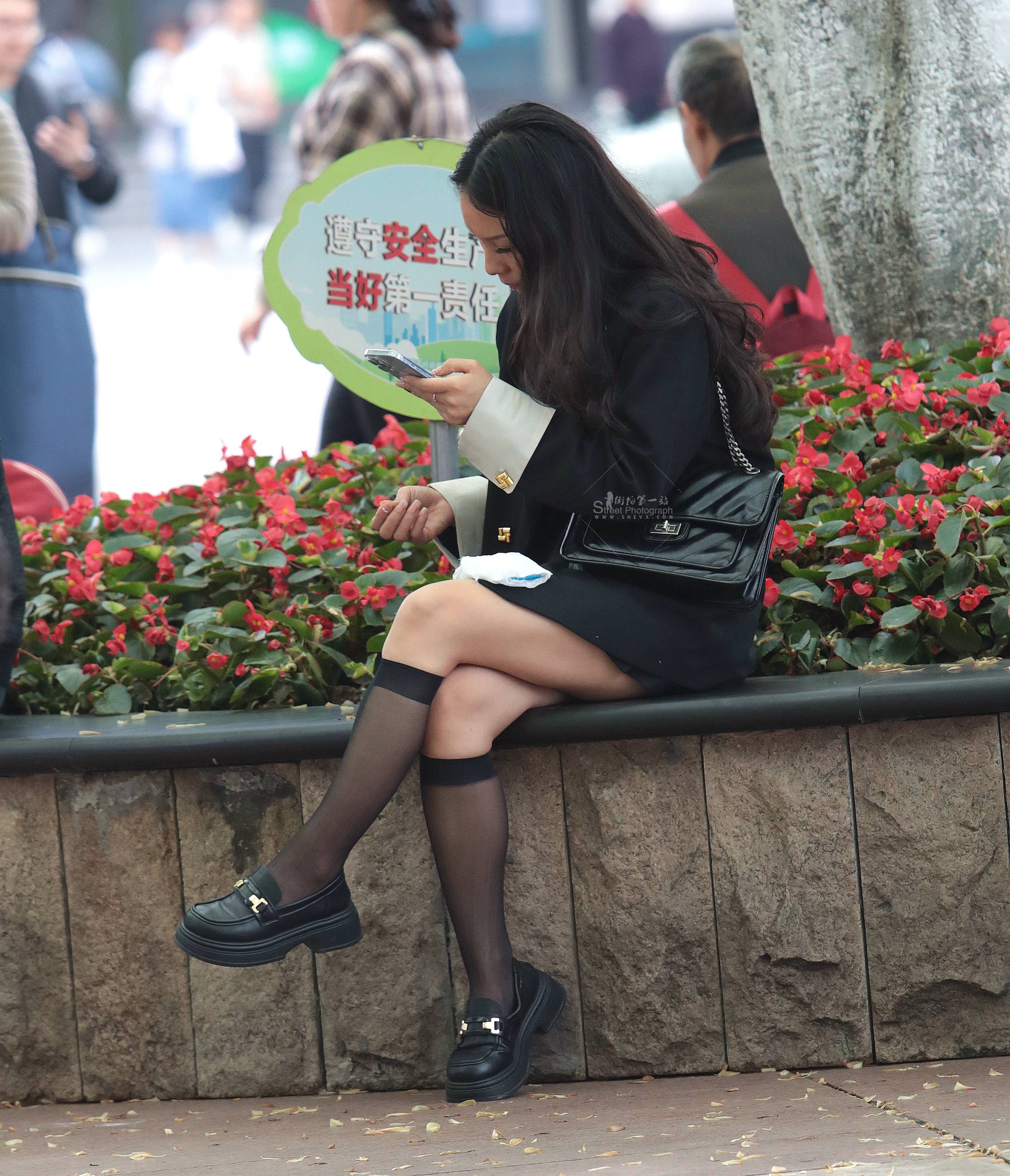 【街拍心灵】爱穿丝袜街拍高跟车模脱鞋歇歇