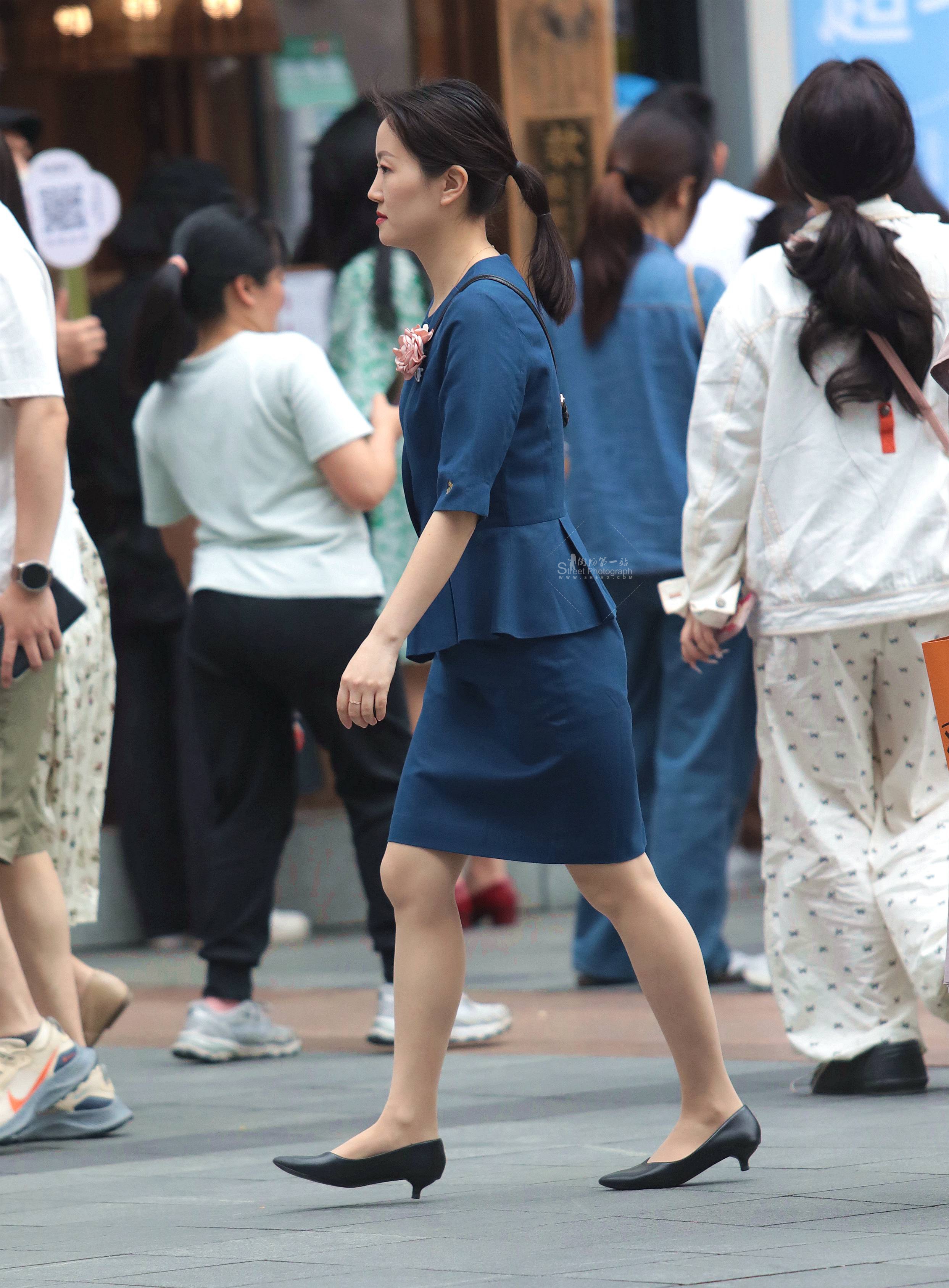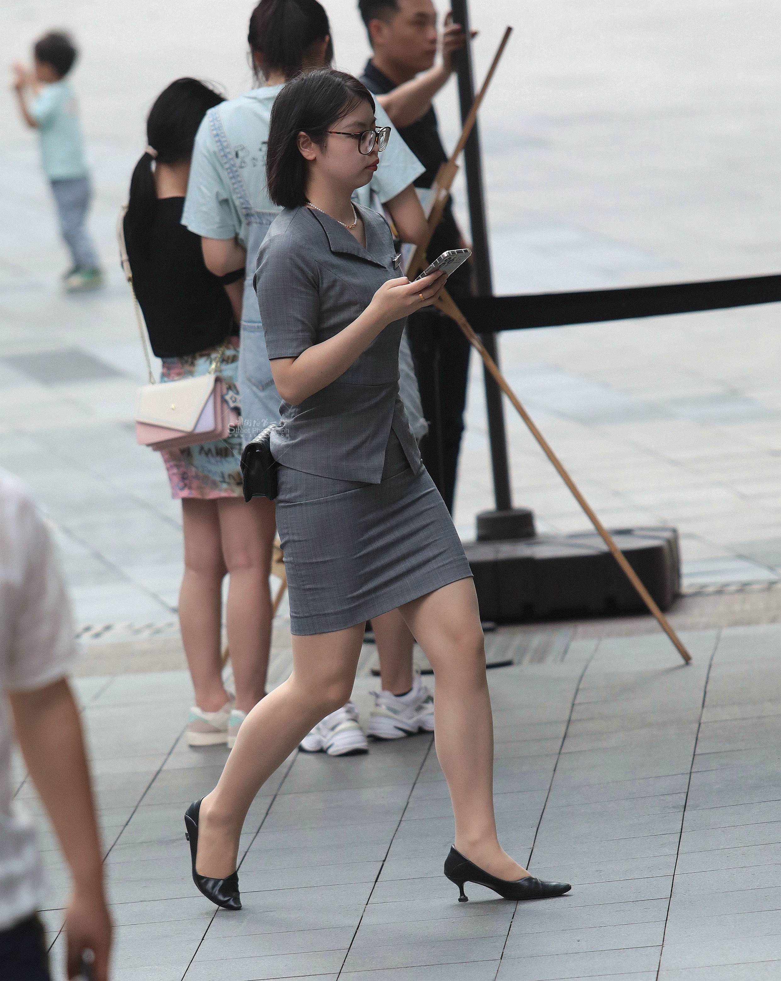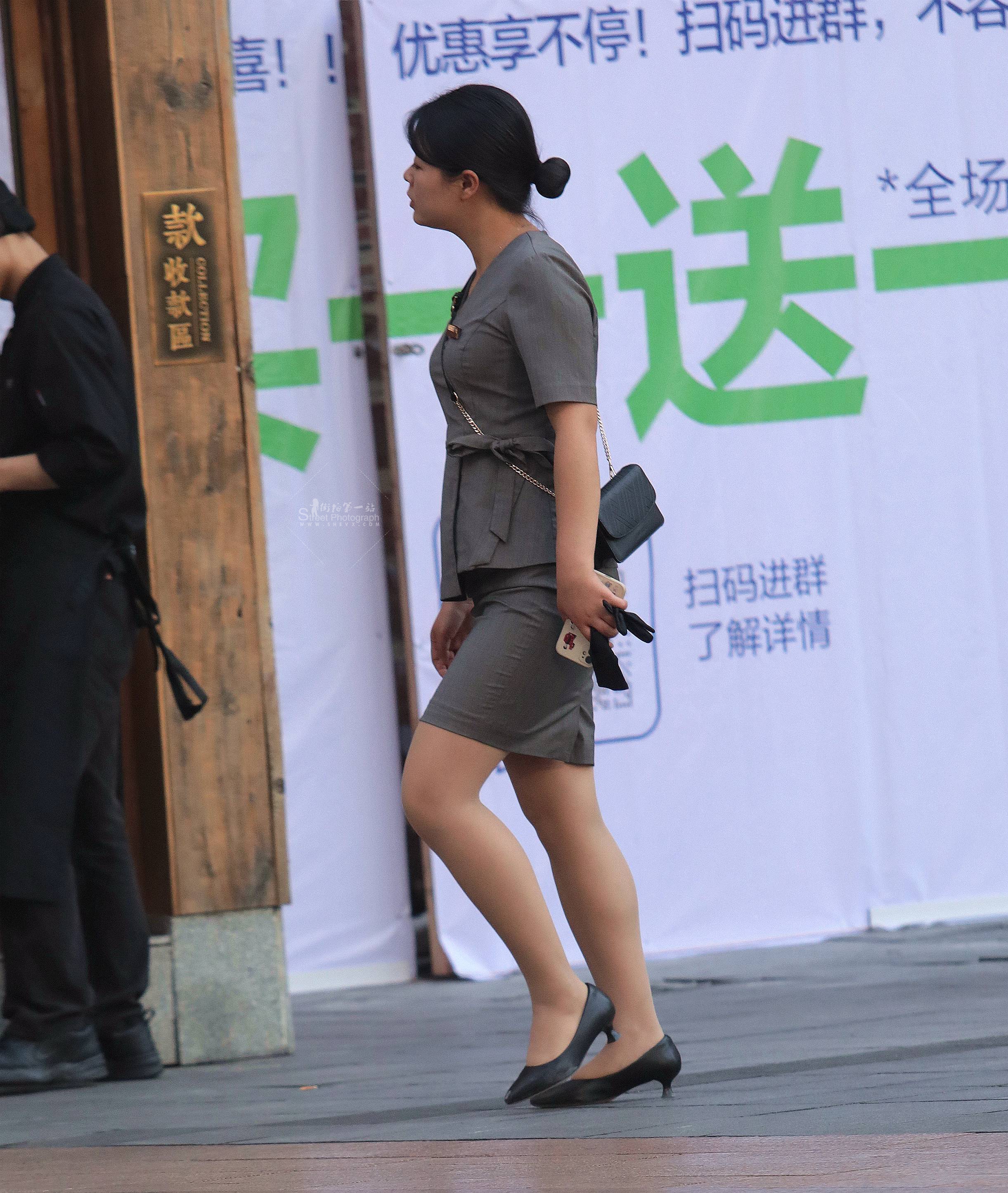【街拍心灵】奔驰销售主管黑丝街拍高跟灰制服美腿