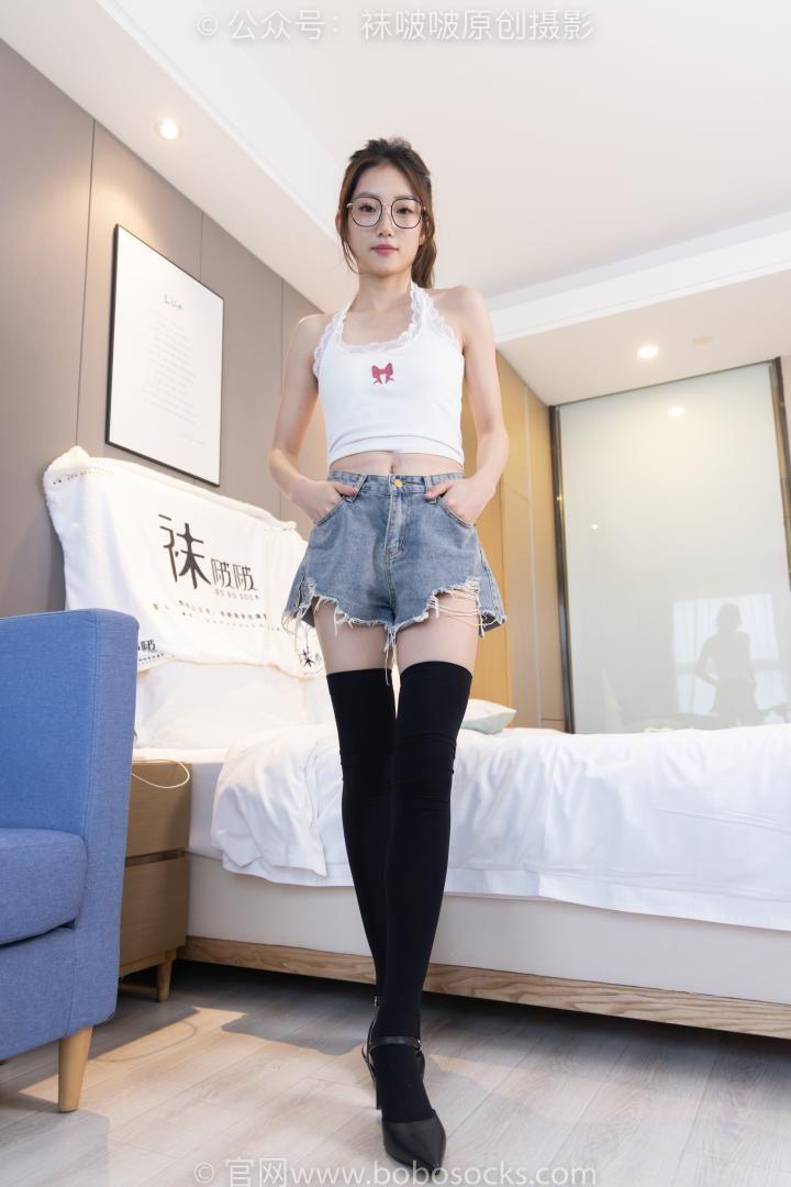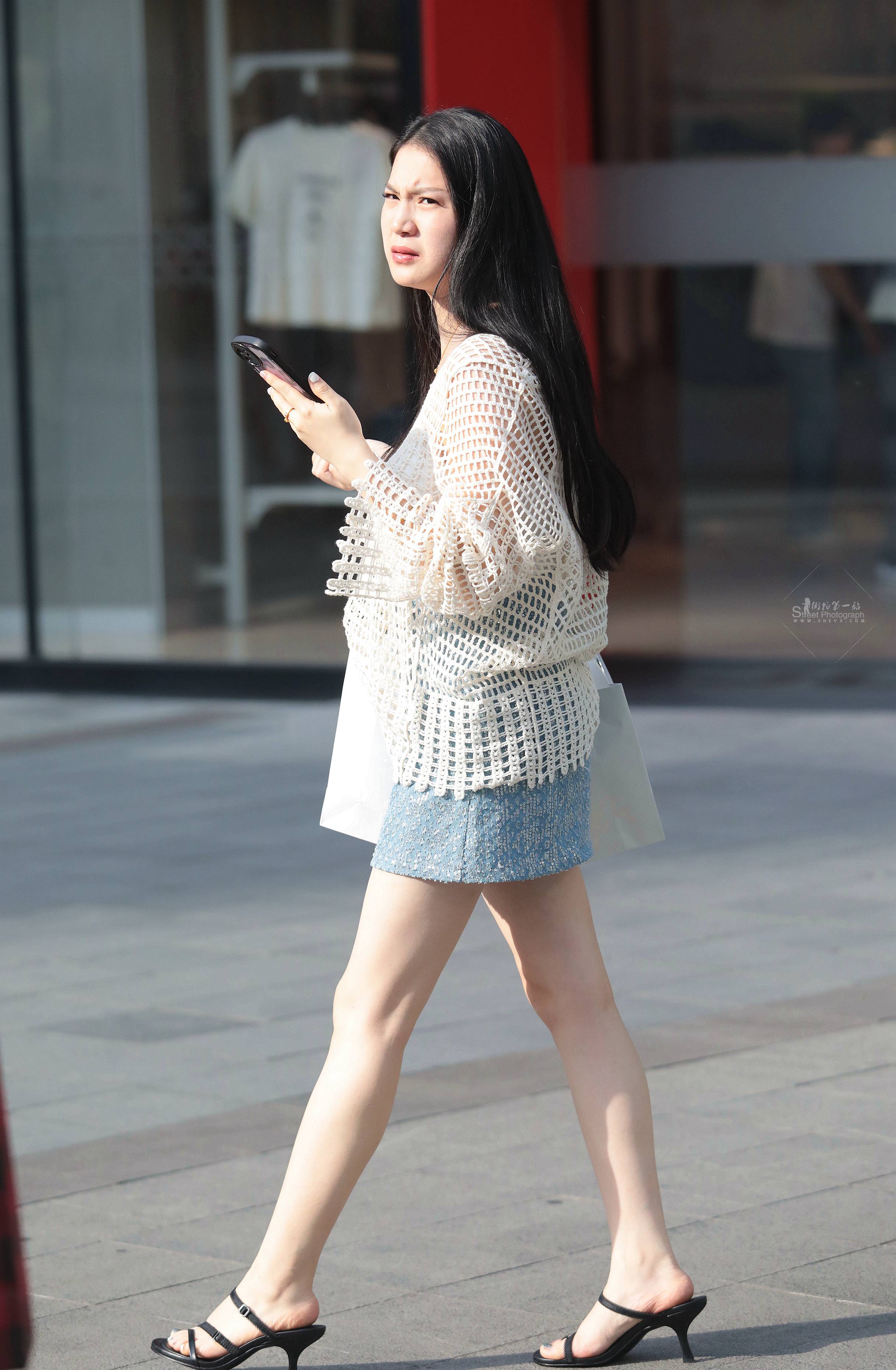 皮肤白皙性感牛仔热裤街拍女人