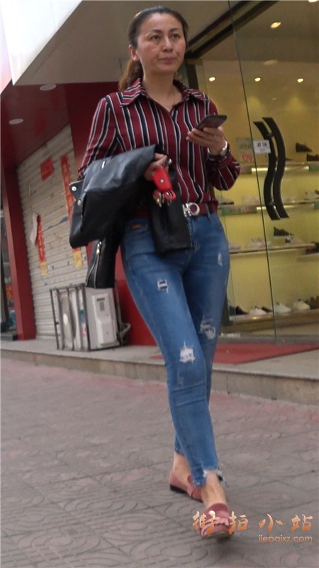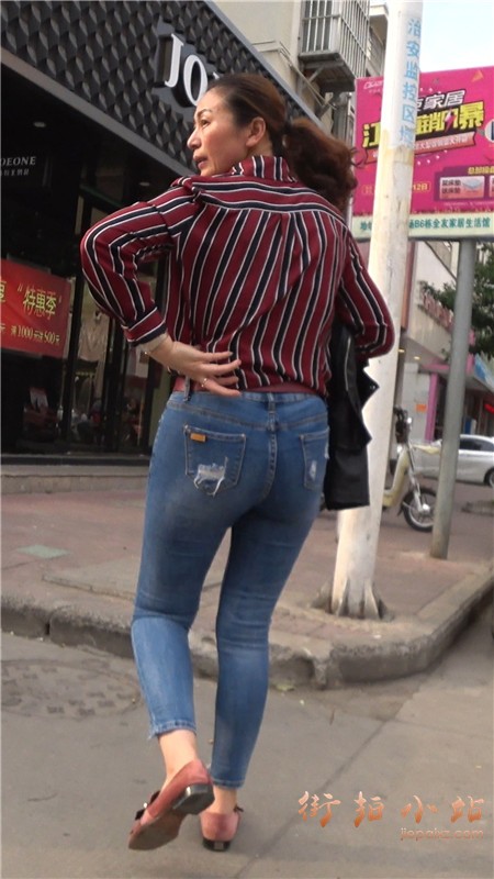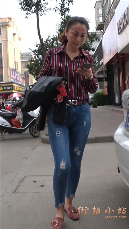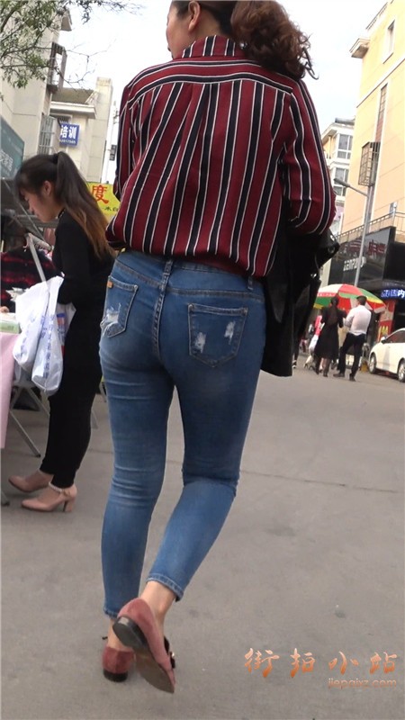4k-街拍紧身蓝牛条纹衬衫成熟美女姐姐