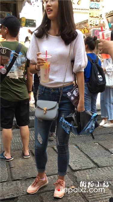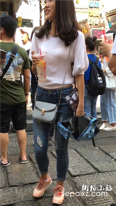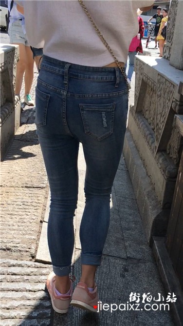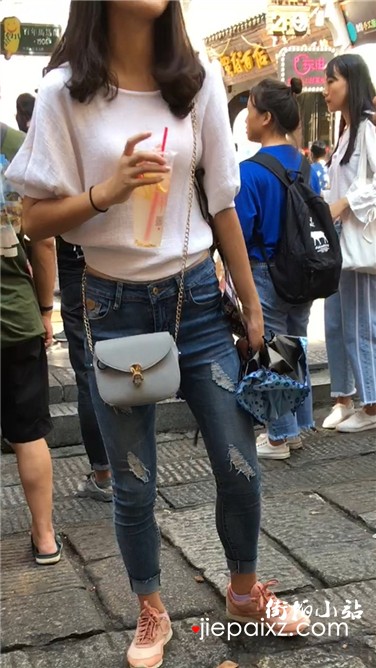 街拍紧身蓝色牛仔裤小清新气质姐姐