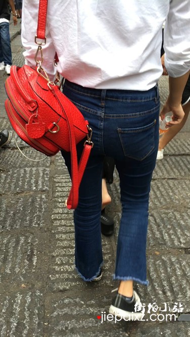 跟拍白衬衫高腰紧身蓝色牛仔裤妹子