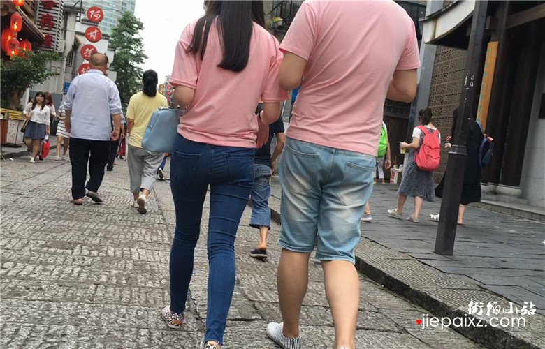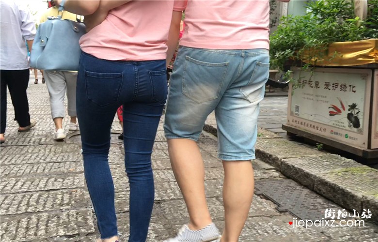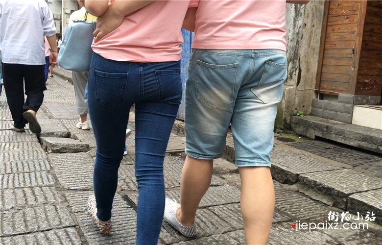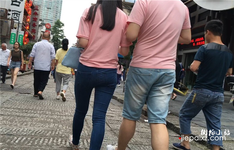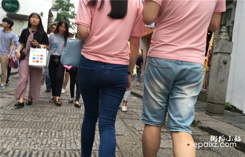 粉色T恤衫紧身蓝牛宽臀美眉