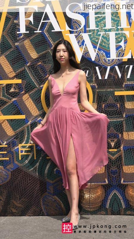 [长裙] 4K-超性感粉红V胸连衣裙街拍美女摆拍DJ026[2.06G]