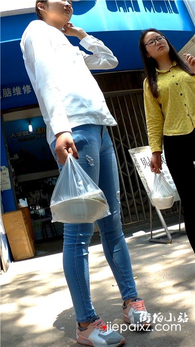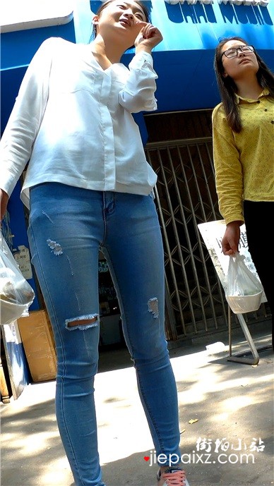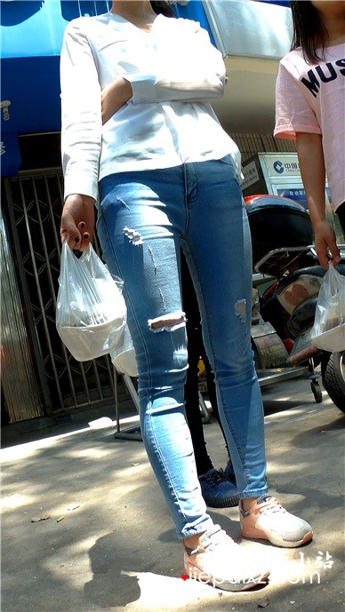 蓝色紧身牛仔裤长腿运动鞋妹子