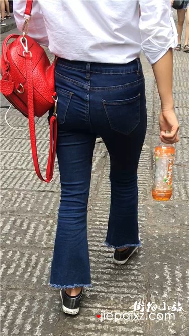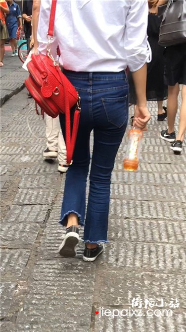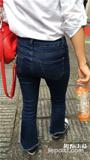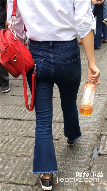 跟拍白衬衫高腰紧身蓝色牛仔裤妹子