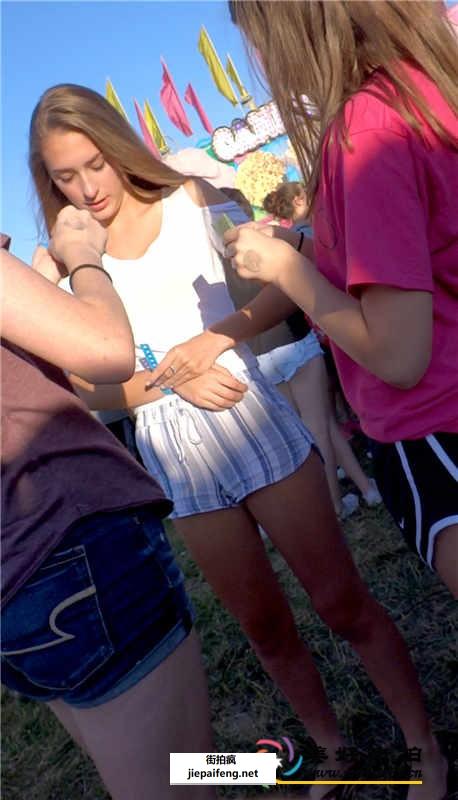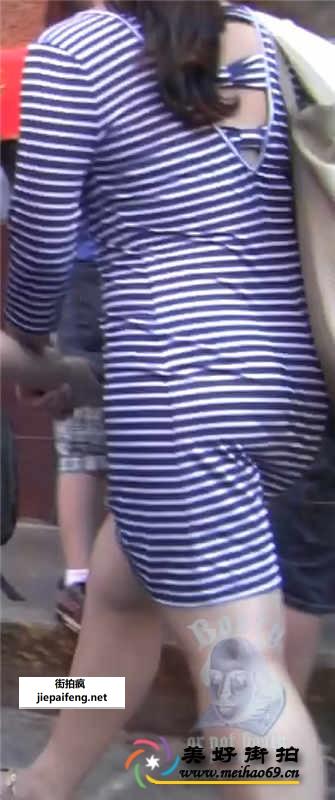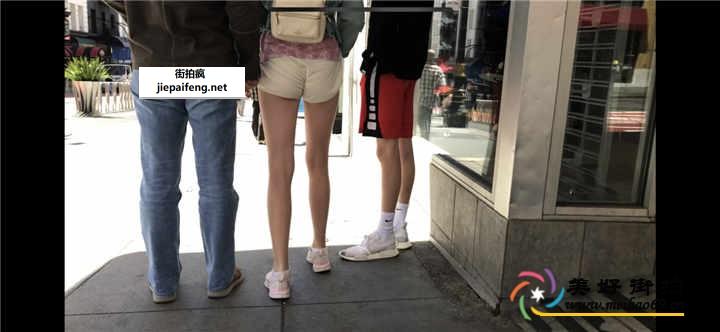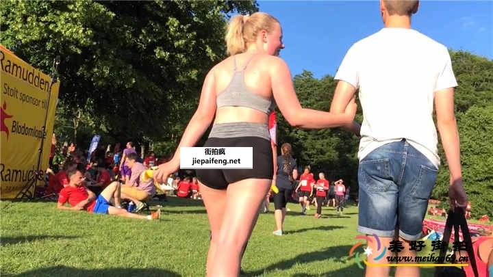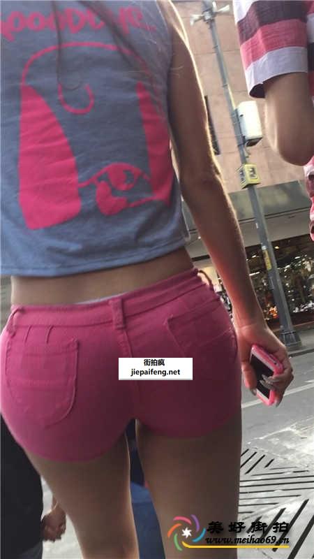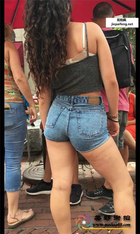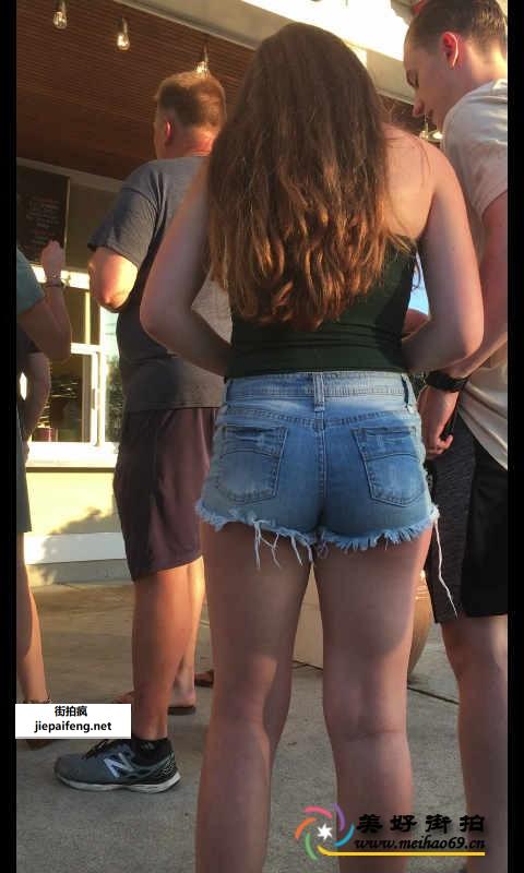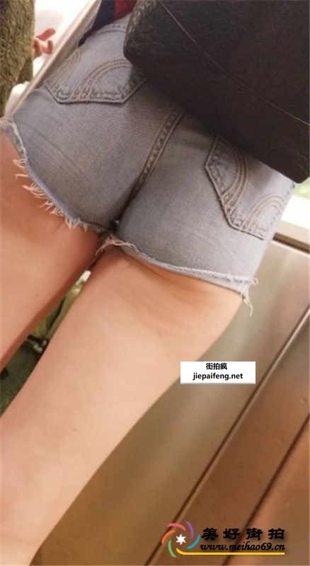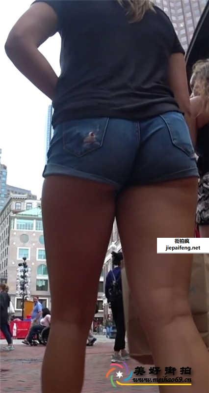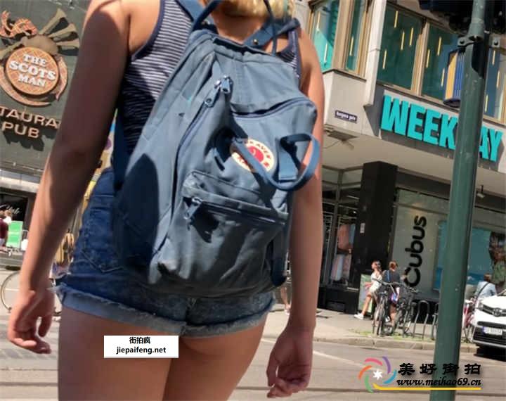 街拍蓝色紧绷牛仔热裤金发美眉极品圆润翘臀[MP4/215M]