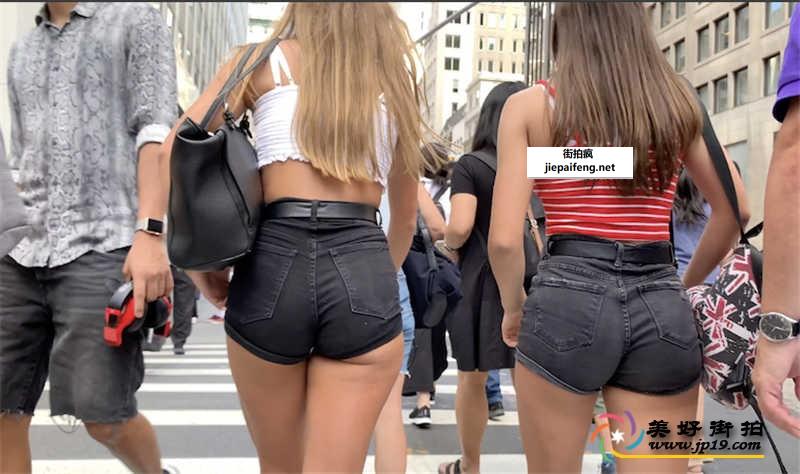 街拍黑色紧绷牛仔热裤金发洋妞性感圆臀[MP4/305M]