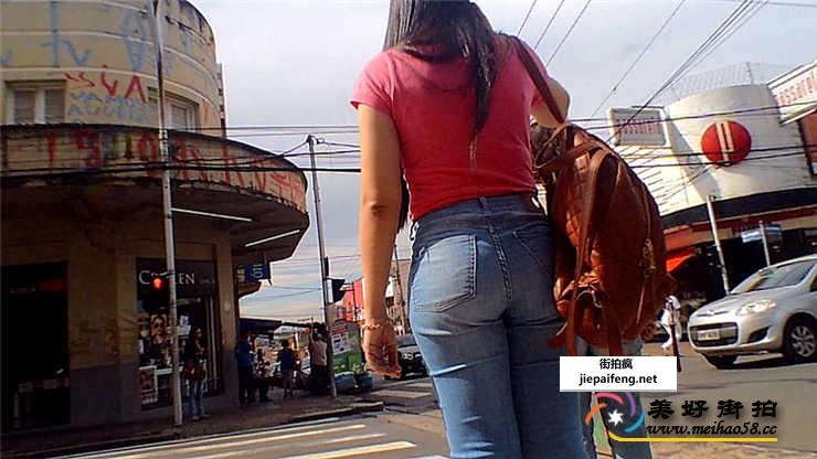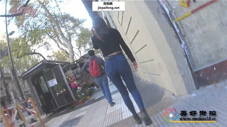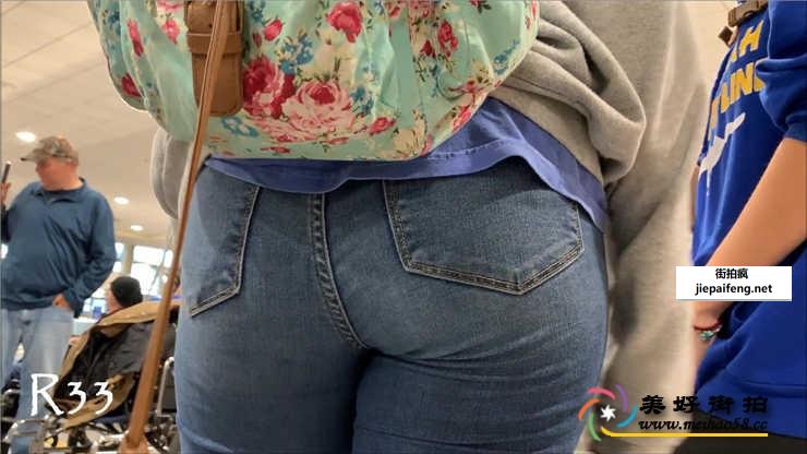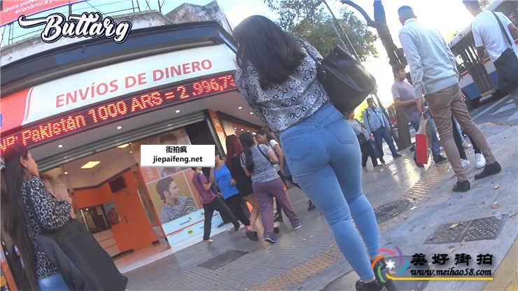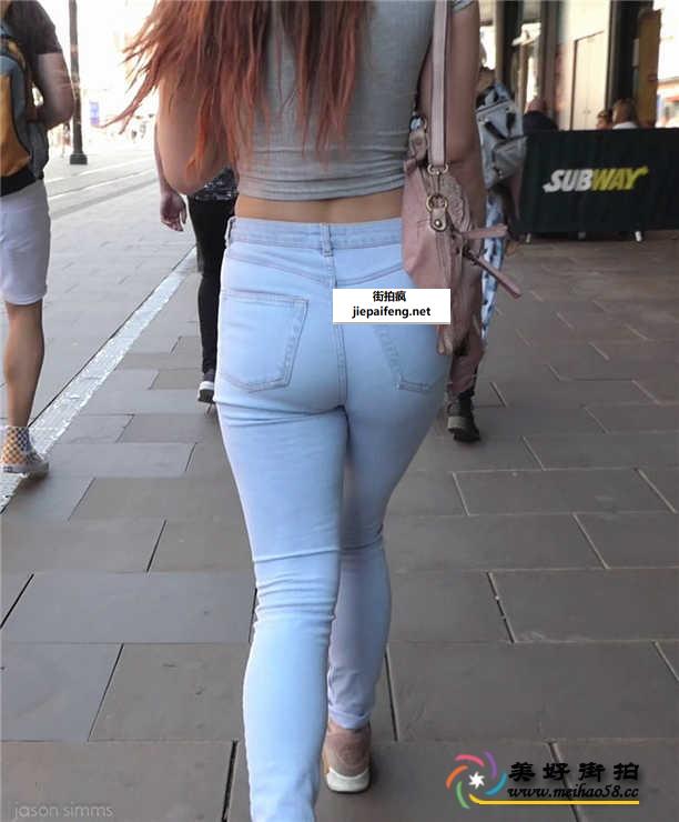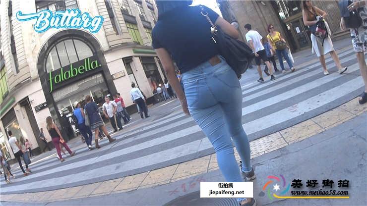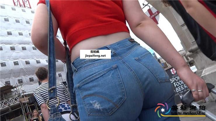 街拍蓝色紧绷牛仔裤OL洋妞饱满翘臀[MP4/508M]