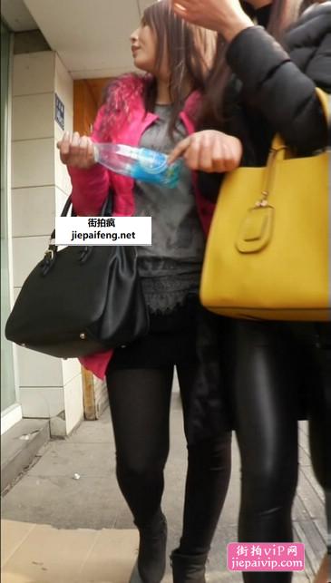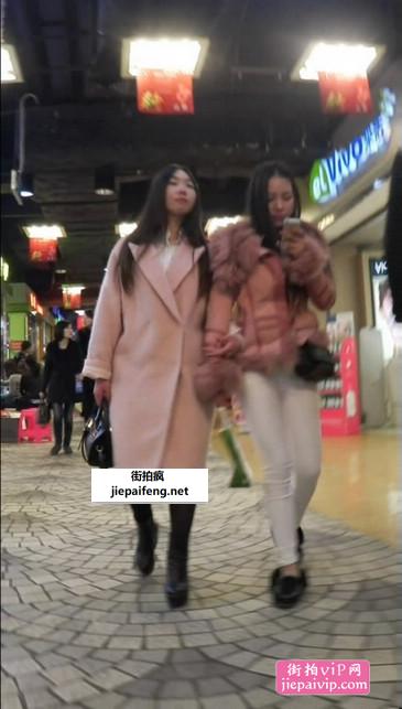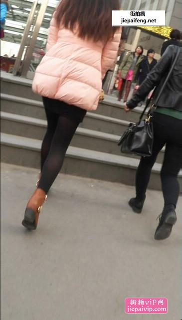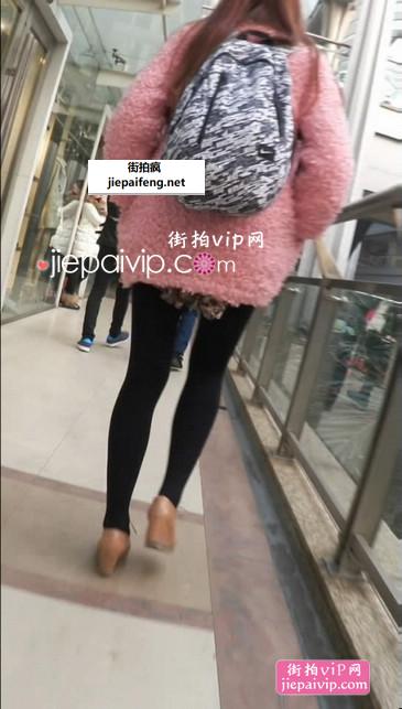 街拍粉红色毛绒外套黑丝美眉