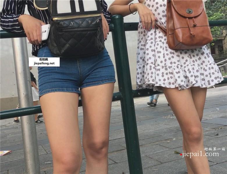 超长街拍性感牛仔短裤美女姐妹等公交车
