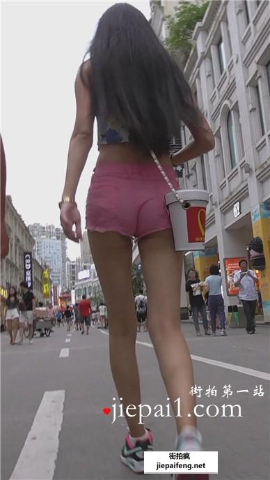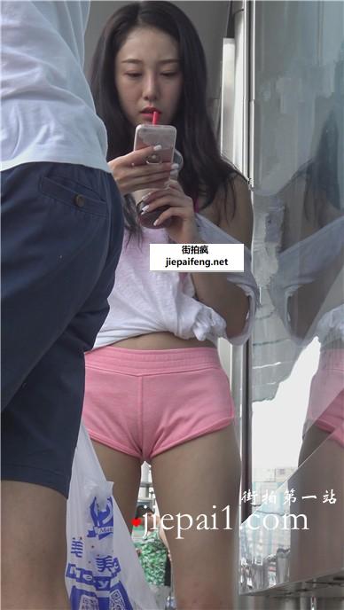 街拍粉热裤露脐小蛮腰美腿运动鞋美女