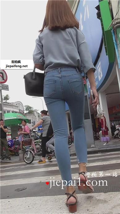 街拍蓝色紧身牛仔裤美眉