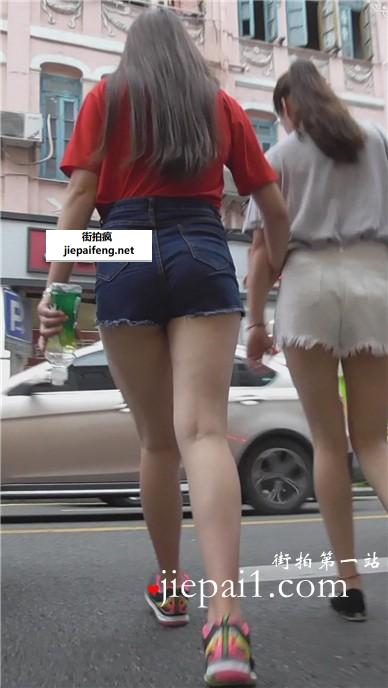 高挑美腿热裤美女跟姐妹一路走一路拍。