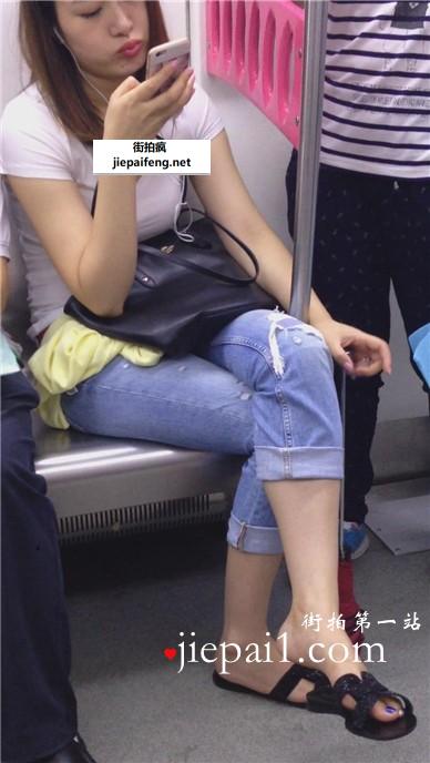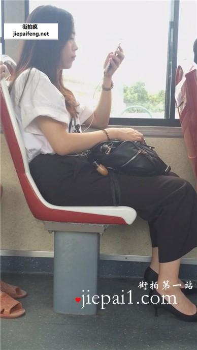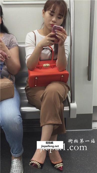 为手机充电席地而坐+车厢内超美红鞋紧身牛仔裤美眉。