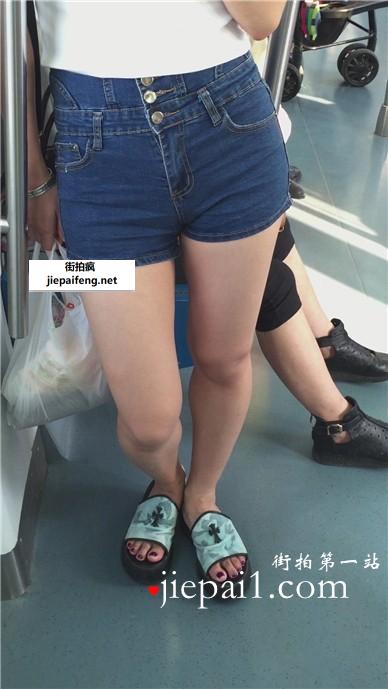 地铁上拍摄紧身牛仔热裤小清新美女,酥胸丰满诱人。