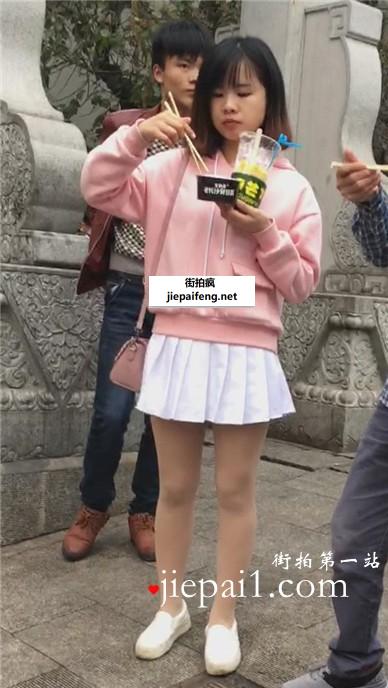 街边偶遇吃东西的粉色甜美可爱小萌妹。