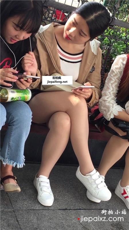 路边花坛玩手机的三位清纯丝袜美腿小美女