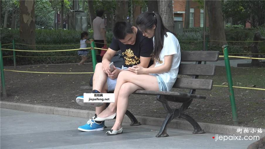 公园长椅上的白皙美腿嫩足热裤马尾辫美女