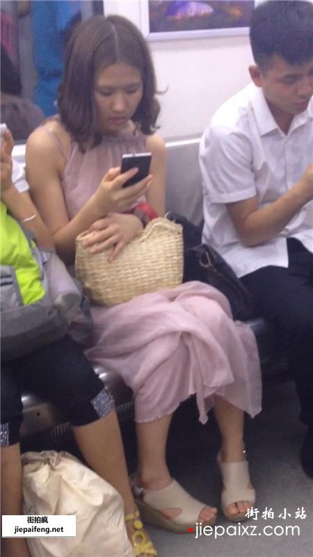 地铁上专注玩手机的文艺小清新连衣裙小姐姐