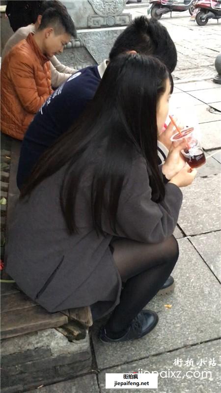 蹲路边喝饮料的黑丝袜美腿青春妹子