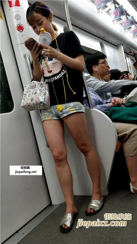 4K地铁上看手机的牛仔热裤街拍丝袜女孩