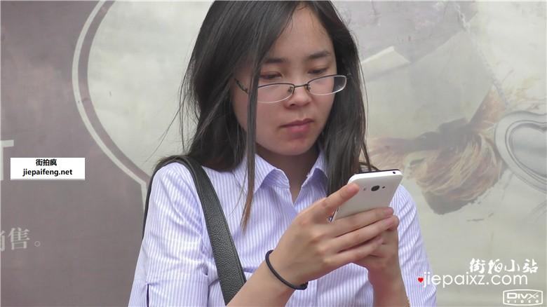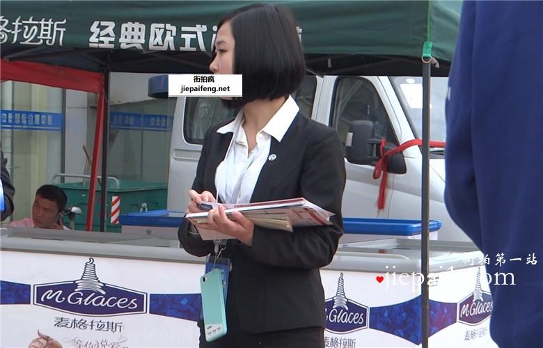 街拍黑色鱼嘴高跟制服促销员短发美眉