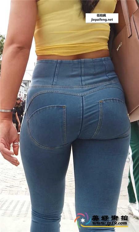街拍蓝色紧身牛仔裤性感圆润翘臀洋妞[MP4/387M]
